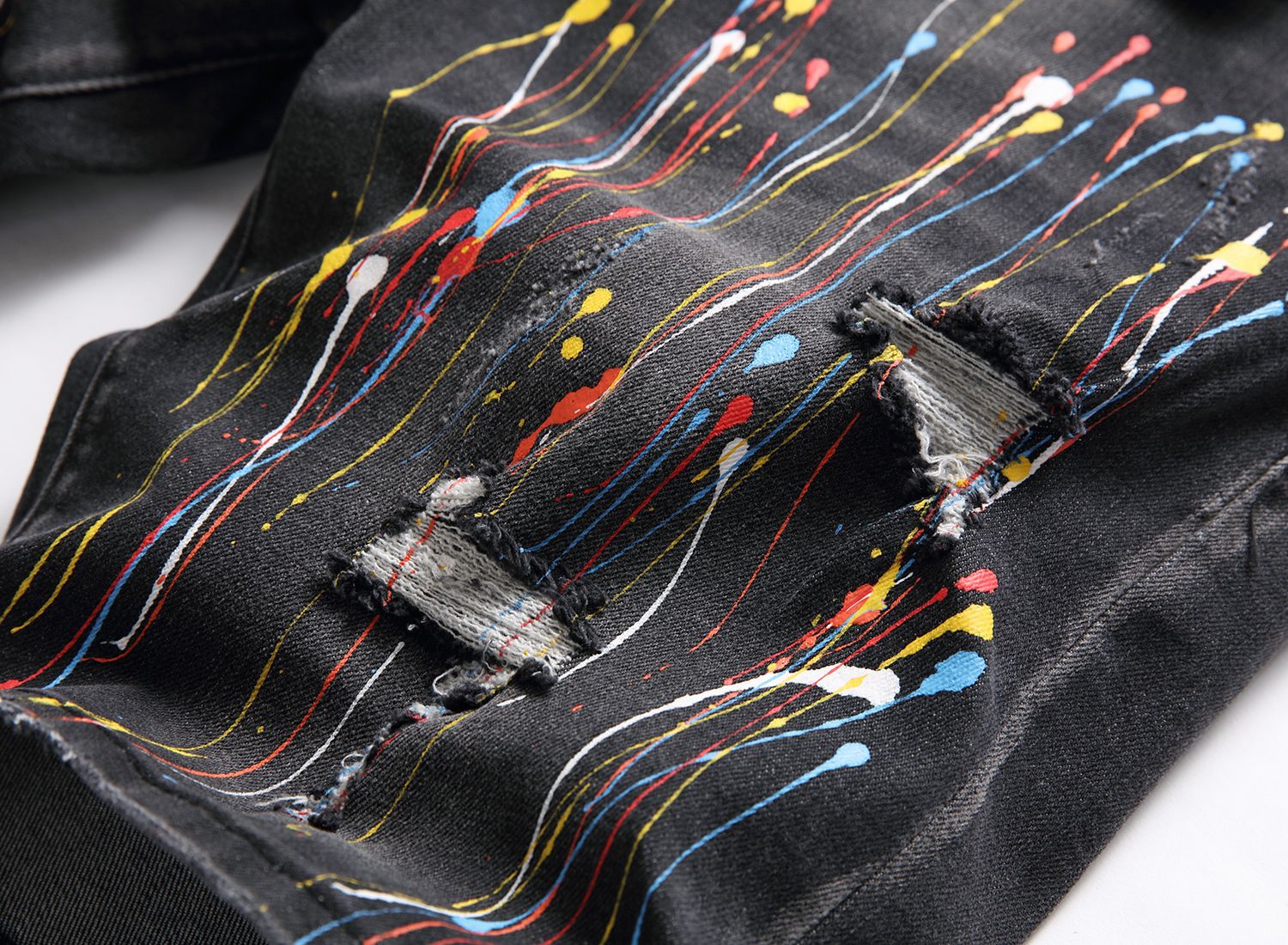 Five-pocket jeans are versatile trousers that are now part of global everyday life. The slim-fit style is ideal for creating many different outfits. This black version with all-over spots is recommended for looks with a rock flavour and is easy to combine with garments with distressed or vintage-looking details.