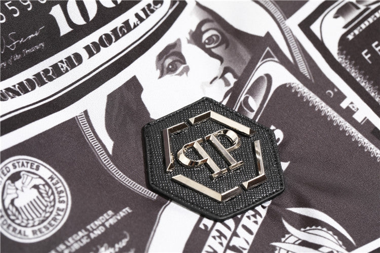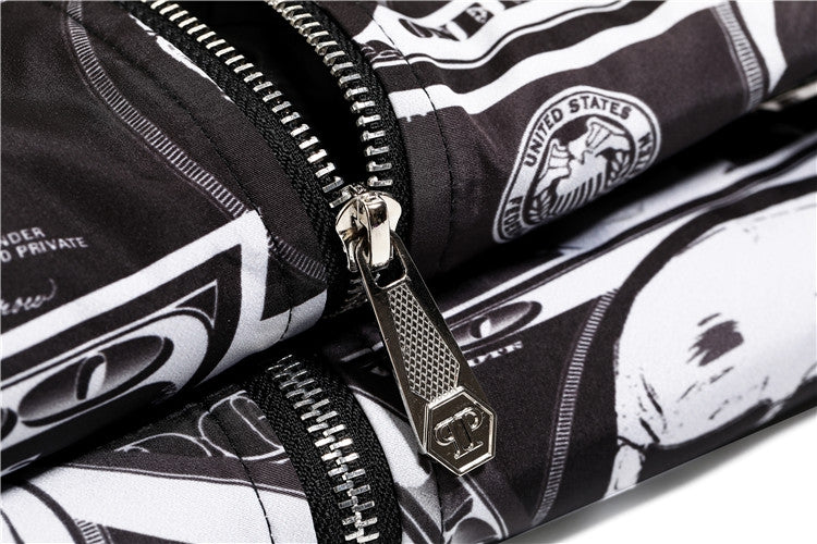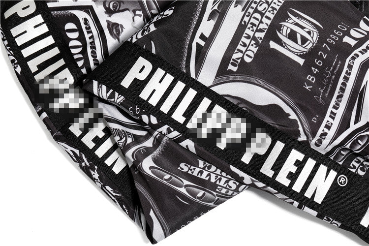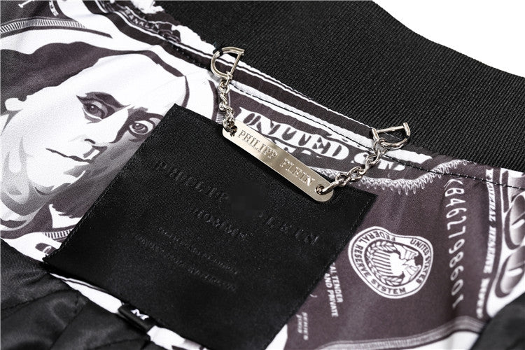 Classic cut leather and cotton zip-up jacket. PP leather slogan printed on front and diamond pattern printed on back