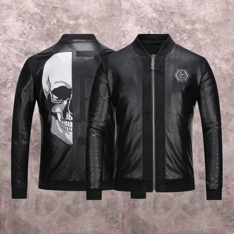 Classic cut leather and cotton zip-up jacket. PP leather slogan printed on front and diamond pattern printed on back