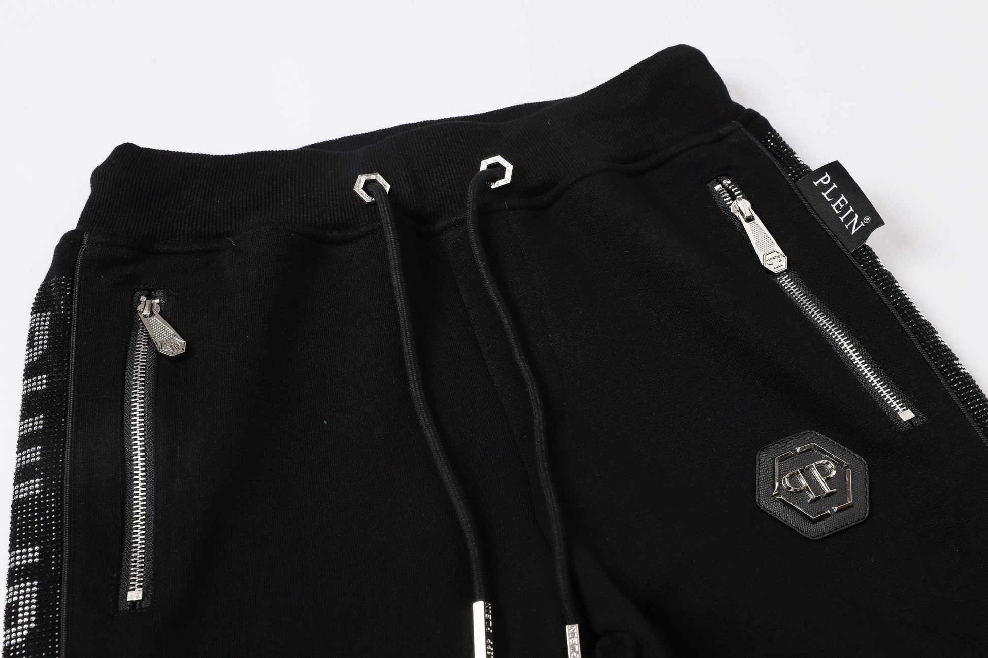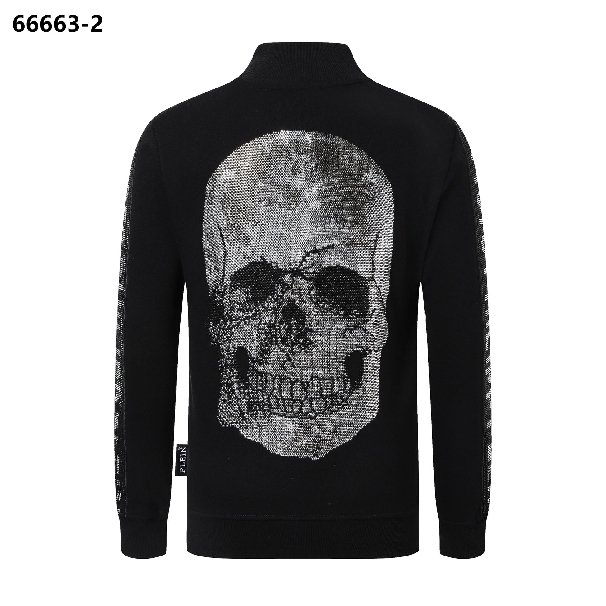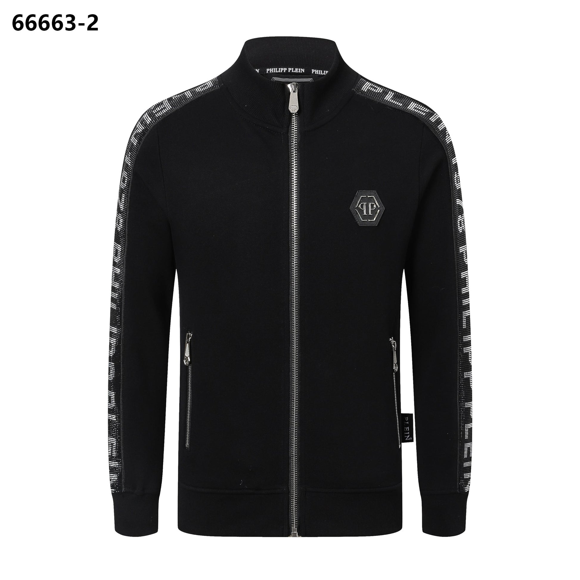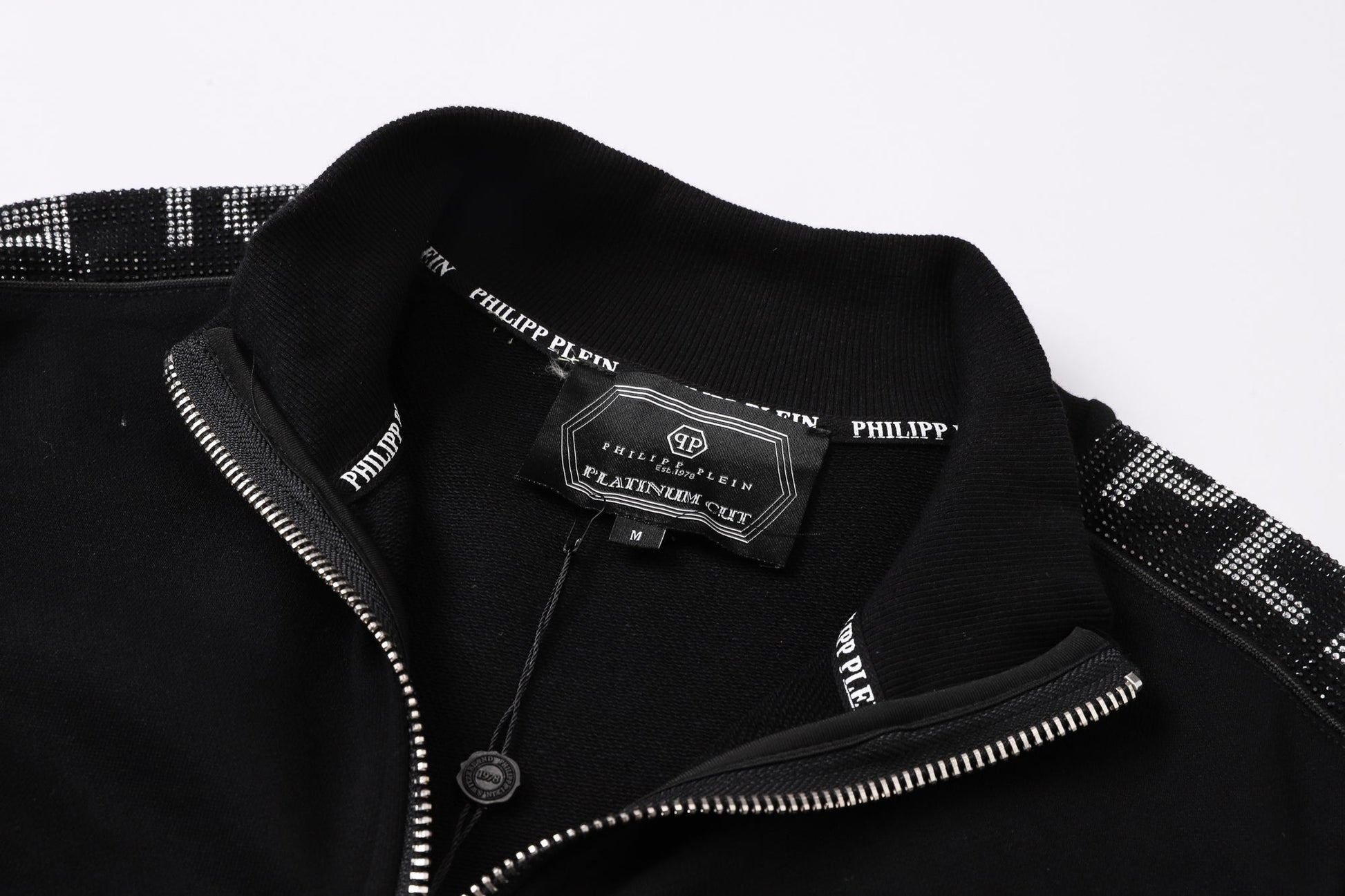Classic cut leather and cotton zip-up jacket. PP leather slogan printed on front and diamond pattern printed on back