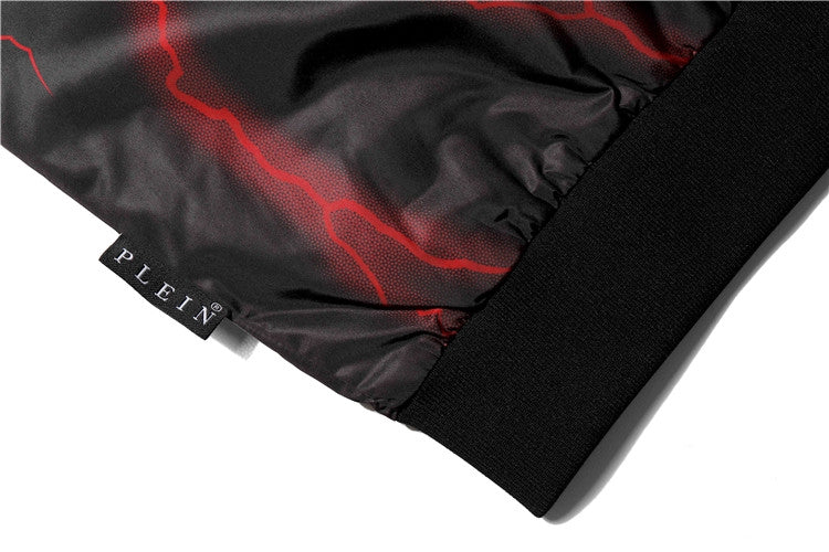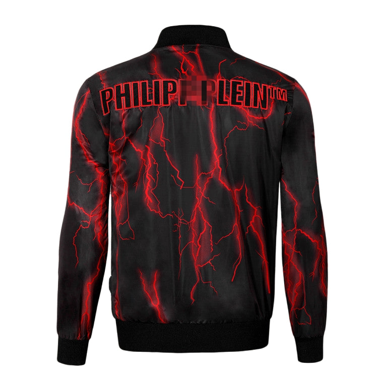 Classic cut leather and cotton zip-up jacket. PP leather slogan printed on front and diamond pattern printed on back